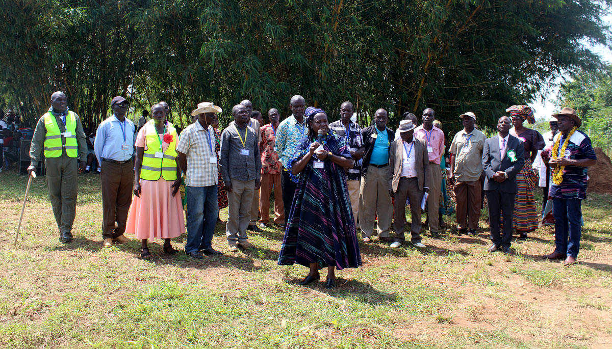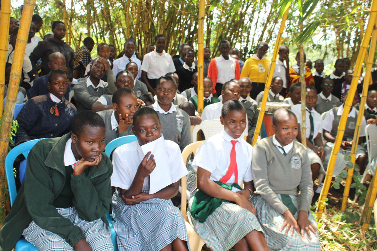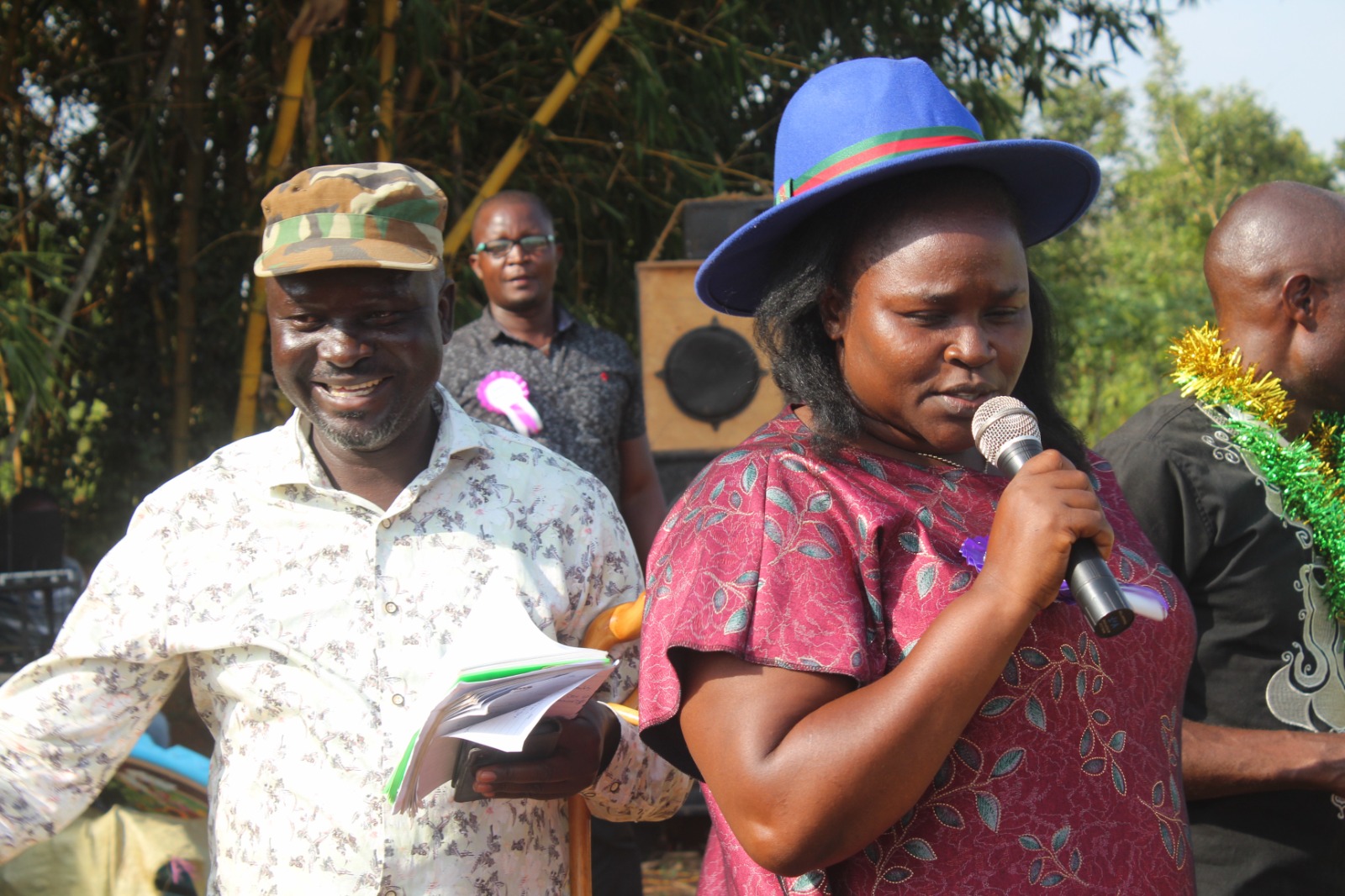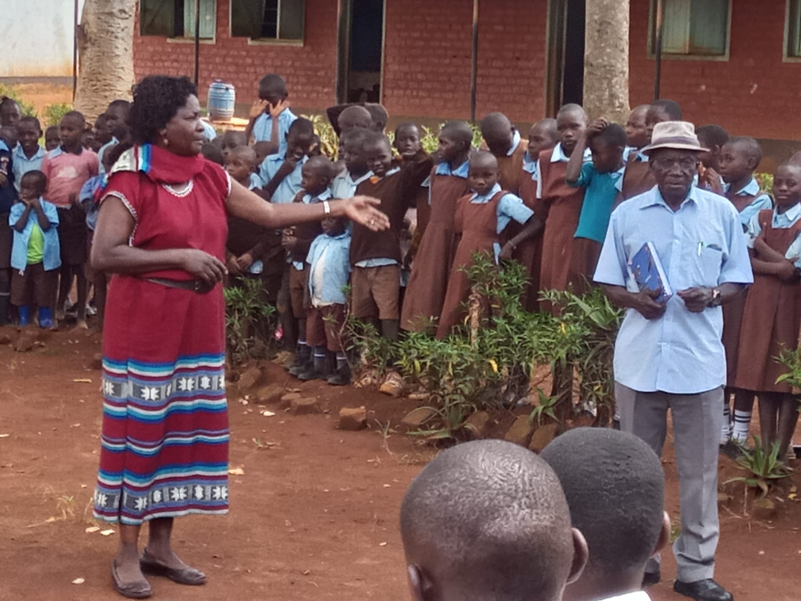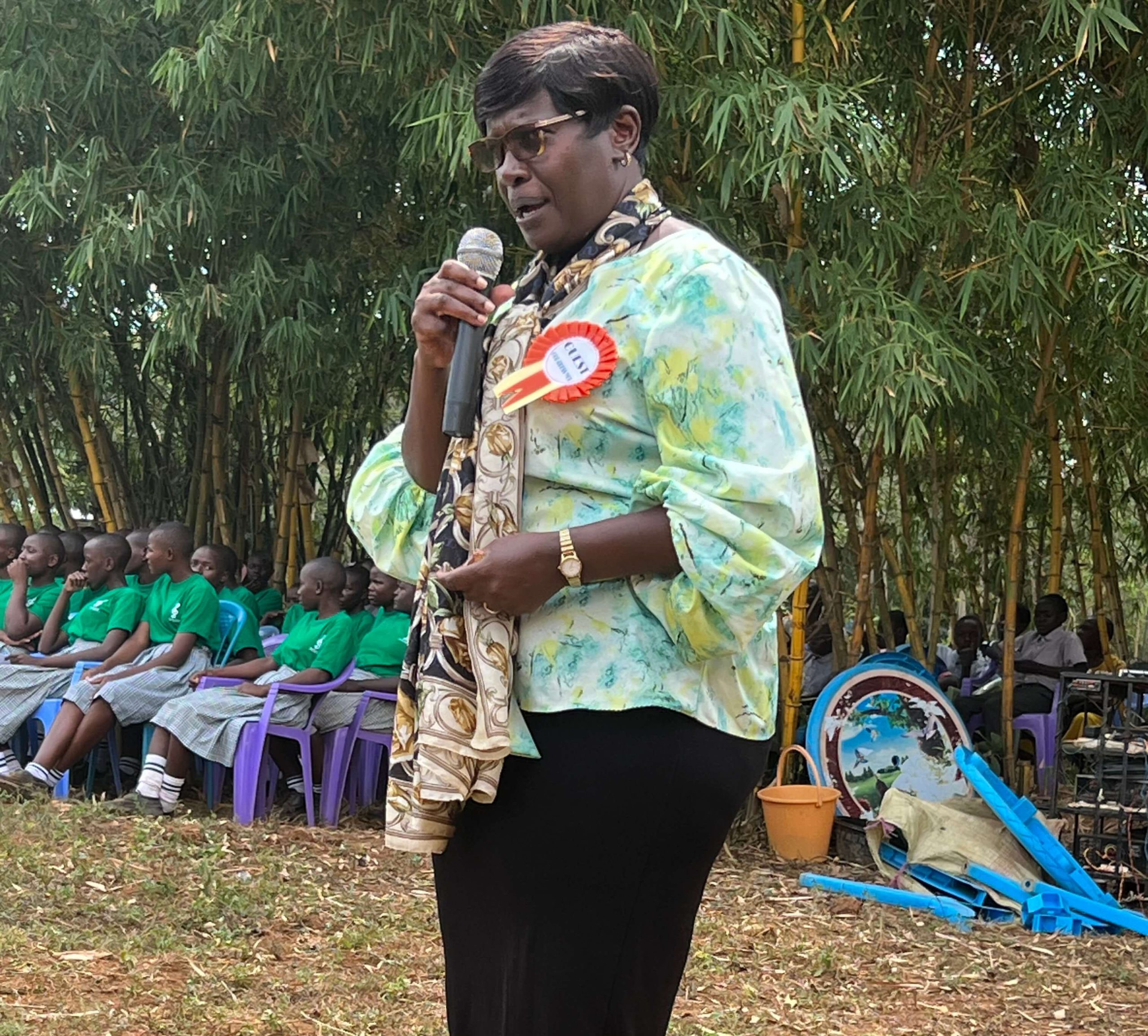 Chairperson Mary Abene Ojiambo and Hon. Secretary James Nyongesa address teachers and students, at Bukeko Primary School.